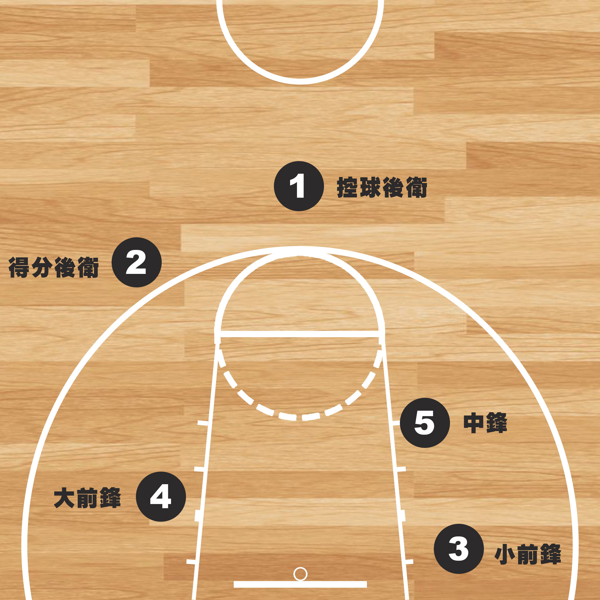 控球後衛:控球後衛是球場上的指揮者,由隊內控球能力最好,助攻能力最強的球員擔任。